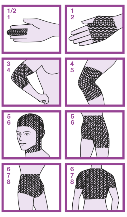 - Vendaje tubular para sujetar apósitos en los muslos y caderas.