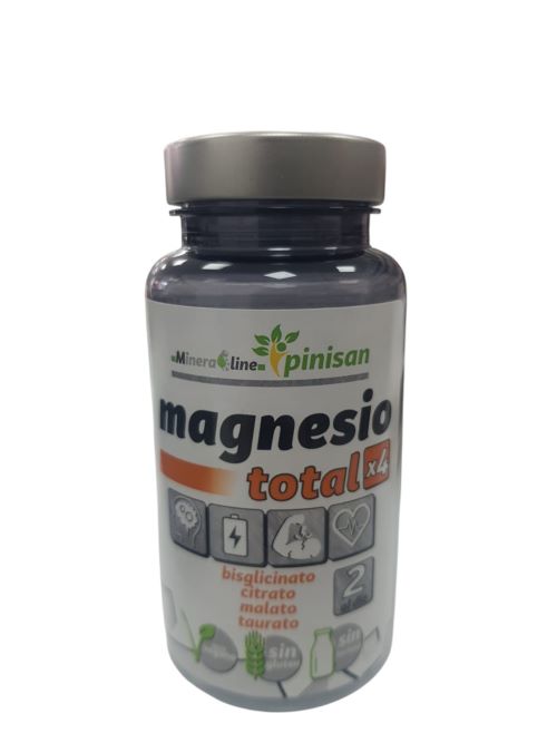 Magnesio Total x4 de Pinisan es un complemento alimenticio que combina cuatro formas altamente asimilables de magnesio: bisglicinato, citrato, malato y taurato, lo que garantiza una excelente absorción y eficacia en el organismo. Está formulado para contribuir al buen funcionamiento muscular, nervioso y energético del cuerpo.