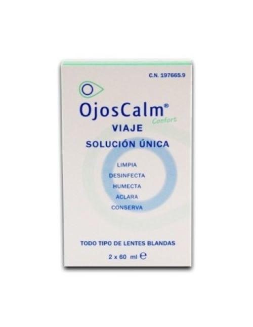 Ojos Calm 2x60ml incluye portalentillas  formato viaje Limpia, aclara, desinfecta, lubrica y conserva las lentillas.  Mantiene los ojos hidratados y combate la sequedad ocular.