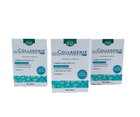 Complemento alimenticio Antienvejecimiento a base de Colágeno marino hidrolizado altamente purificado de tipo I y III, Ácido hialurónico, Resveratrol, Vitamina C, Zinc y Cobre. La vitamina C contribuye a la formación normal de Colágeno para el funcionamiento normal de la piel. El cobre contribuye al mantenimiento del tejido conectivo en condiciones normales. El zinc contribuye al mantenimiento de la piel en condiciones normales. La vitamina C, el cobre y zinc tributen a la protección de las células frente al daño oxidativo.